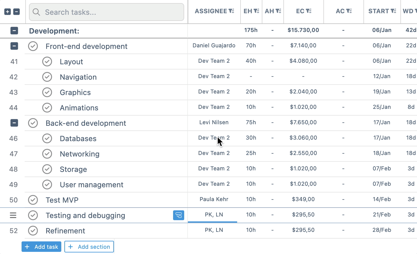 When there are no Estimated Hours (EH) for tasks, the Estimated Cost column will only display fixed costs. The system will automatically calculate variable costs when both EH and Hourly rates are added to the project.